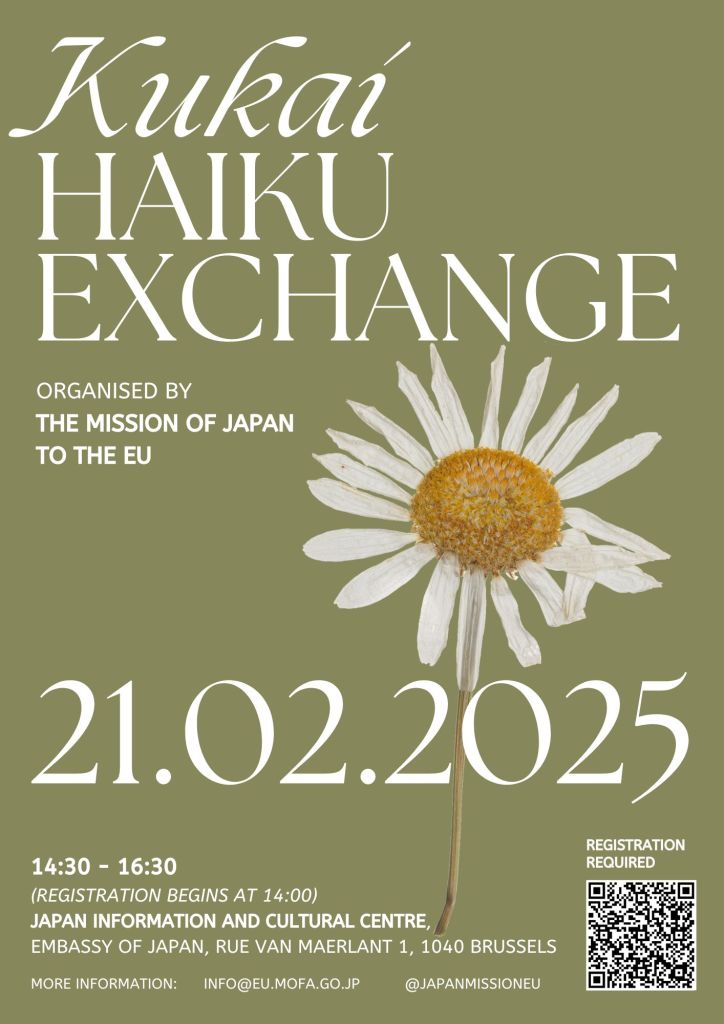 The Mission of Japan to the EU has the honour of inviting you to its first ever Kukai haiku exchange session on Friday 21st February 2025 that will bring together a small group of haiku practitioners from around Belgium to share and discuss their original haiku with each other and an audience.