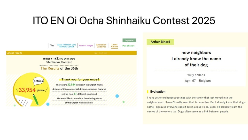 Tijdens de haiku-ontmoetingsdag in Wassenaar zijn de winnaars van de ‘Paul Mercken Aanmoedigingsprijs’ voor het jaar 2025 bekend gemaakt. Eervolle vermeldingen waren er voor Noor de Jong, Monique Bol en Eveline van Dienst. De derde prijs ging naar Annette Akkerman en de tweede prijs was voor Hendrik-Jan de Wit. De winnaar van de eerste prijs was Benoit Van der Cruysse. Alle prijswinnaars van harte gefeliciteerd!
